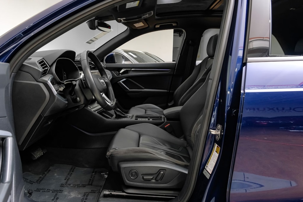 Adorned in the captivating Navarra Blue Metallic exterior, this Q3 exudes a bold and confident presence on the road. Featuring the Black Optic Sport Package, it boasts a host of distinctive design elements, including 19-inch 5-double-arm design wheels, high-gloss black exterior accents, and sleek black roof rails, creating a striking and sporty aesthetic.