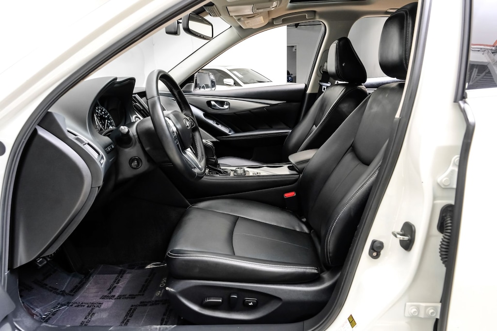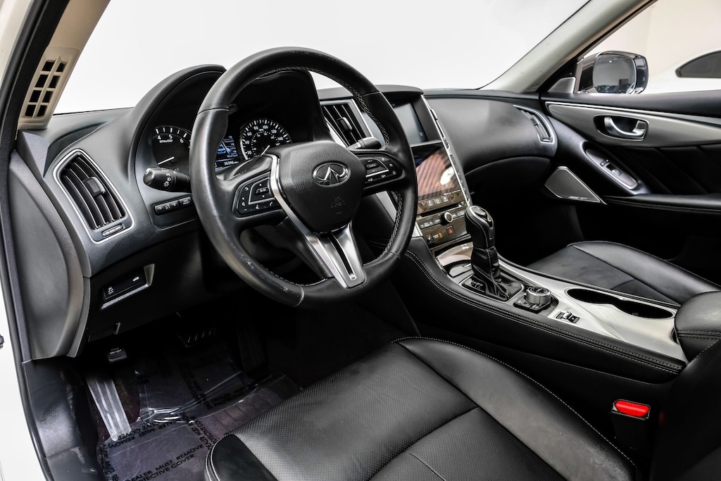*Bluetooth / Hands Free Cell Phone*, *Moonroof/Sunroof, *Rear Backup Camera*, *Navigation*, *Leather*, *One Owner*, *Remainder of Factory Warranty*, *Apple Carplay/Android Auto, *Non Smoker*, Q50 LUXE, 4D Sedan, 3.0L V6, 7-Speed Automatic with Overdrive, RWD, Majestic White, Graphite Leather, Cargo Net, Cargo Package, First Aid Kit, Shopping Bag Hooks, Trunk Mat, 16 Speakers, 18" x 7.5" Aluminum Alloy Wheels, 4-Wheel Disc Brakes, ABS brakes, Air Conditioning, All Weather Package, All-Season Floor Mats, Alloy wheels, AM/FM radio: SiriusXM, Auto High-beam Headlights, Auto tilt-away steering wheel, Auto-dimming Rear-View mirror, Automatic temperature control, Blind Spot Warning, Brake assist, Bumpers: body-color, CD player, Compass, Delay-off headlights, Driver door bin, Driver vanity mirror, Dual front impact airbags, Dual front side impact airbags, Electronic Stability Control, Emergency communication system: INFINITI Connection, Four wheel independent suspension, Front anti-roll bar, Front Bucket Seats, Front Center Armrest, Front dual zone A/C, Front fog lights, Front reading lights, Fully automatic headlights, Garage door transmitter: HomeLink, Heated door mirrors, Heated Front Bucket Seats, Heated front seats, Heated steering wheel, Illuminated entry, Leather Shift Knob, Leather steering wheel, Leather-Appointed Seating Surfaces, Literature Kit, Low tire pressure warning, Memory seat, Occupant sensing airbag, Outside temperature display, Overhead airbag, Overhead console, Panic alarm, Passenger door bin, Passenger vanity mirror, Power door mirrors, Power driver seat, Power moonroof, Power passenger seat, Power steering, Power windows, Radio data system, Radio: INFINITI InTouch Dual HD Display System, Rain sensing wipers, Rear anti-roll bar, Rear reading lights, Rear seat center armrest, Rear USB/Power Delivery Port, Rear window defroster, Remote keyless entry, Security system, Speed control, Speed-Sensitive Wipers, Splash Guards, Split folding rear seat, Steering wheel memory, Steering wheel mounted audio controls, Tachometer, Telescoping steering wheel, Tilt steering wheel, Traction control, Trip computer, Trunk Protector, Turn signal indicator mirrors, Variably intermittent wipers, Go Luxury Black Out Package, Original Msrp $45110, Q50 LUXE, 4D Sedan, 3.0L V6, 7-Speed Automatic with Overdrive, RWD, Majestic White, Graphite Leather, Cargo Net, Cargo Package, First Aid Kit, Shopping Bag Hooks, Trunk Mat.